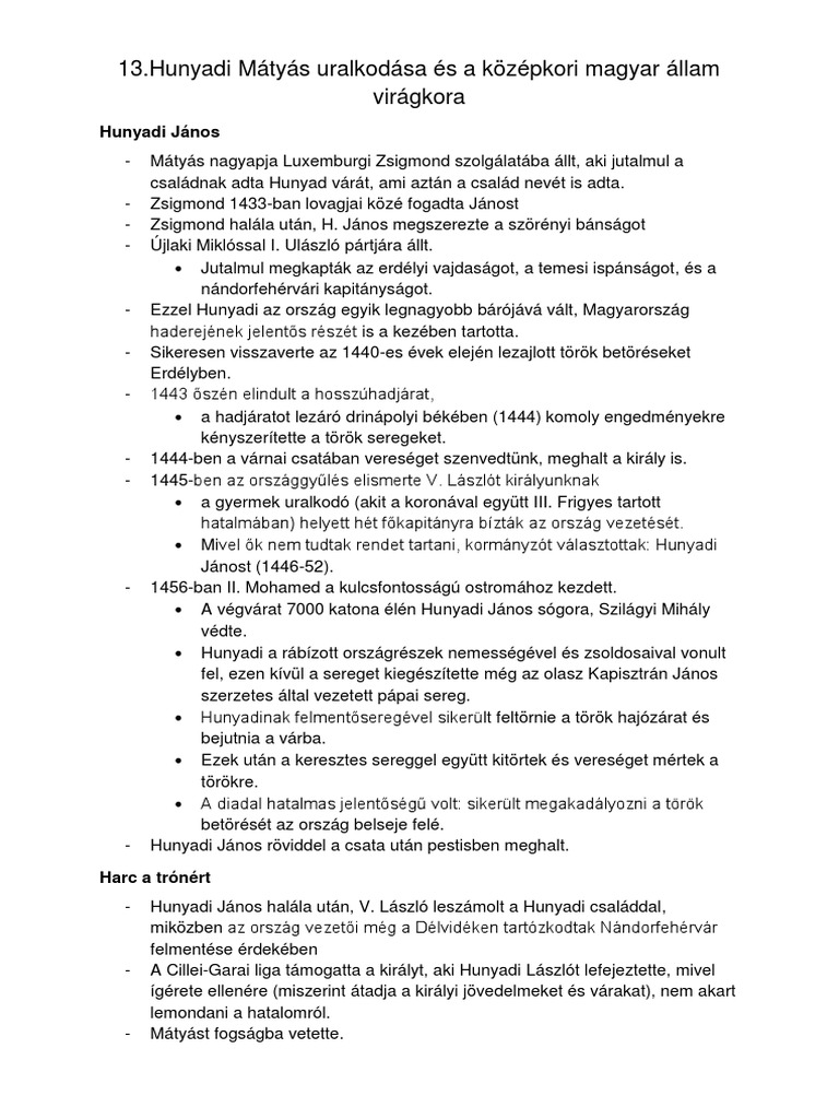 A Hunyadiak Magyarorszagon Tortenelem Kidolgozott Erettsegi Tetel Erettsegi Com